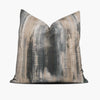 A linen-blend throw pillow with an abstract watercolor motif sits against a white background. The pillow includes shades of charcoal gray, steel blue, and beige.